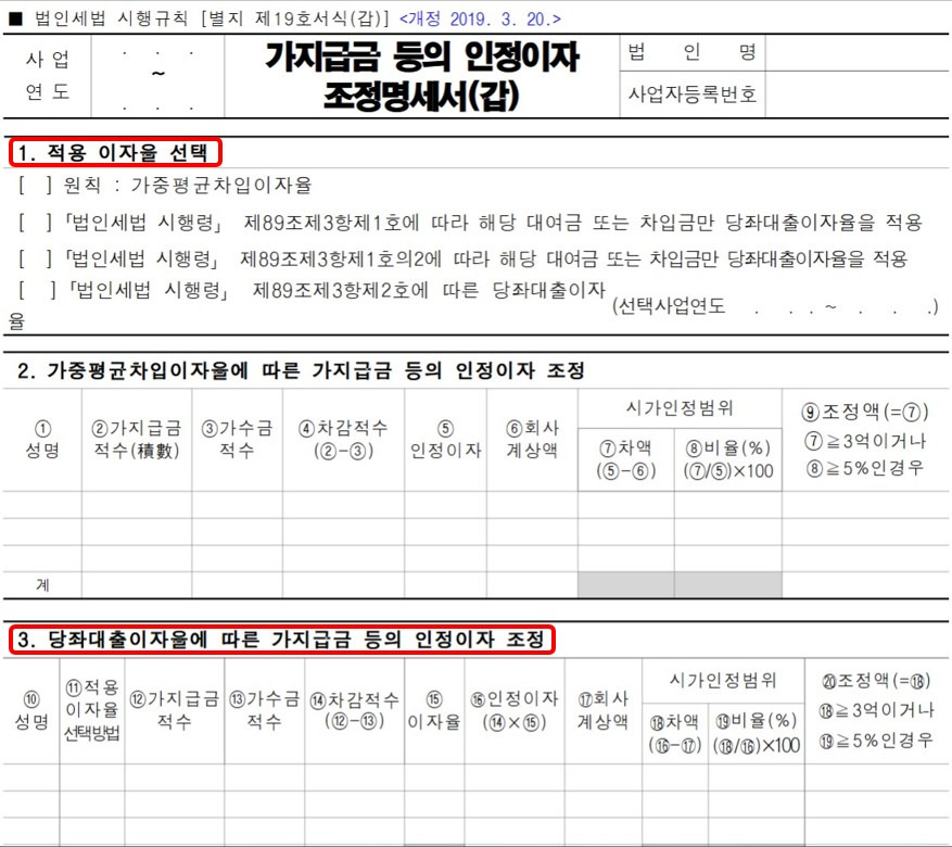 ④ B회사의 2019사업연도 법인세(인정이자율) 신고내용에 의하면, ‘1. 적용이자율 선택’ 기재란에서는 法令§89③2를 선택하고 있으나, 개별 자금거래에 관하여 구체적으로 신고하는 ‘3. 당좌대출이자율 등에 의한 가지급금 등 인정이자 조정’ 기재란에서는 ‘㉮’,