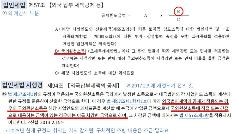 외국납부세액공제(Foreign Tax Credits)는 법인세금을 줄이는 요소인데, 세법상 바로 위에서 보시는 최대 ‘공제한도금액’까지만 세금차감을 인정합니다(‘세액공제액 < 한도액’이면 세액공제액을 적용). 이 때, ‘국외원천소득’ 금액이 크면 클수록, 세액공제액 및 한도액은 증가할테니 법인세금이 줄어들 거예요.